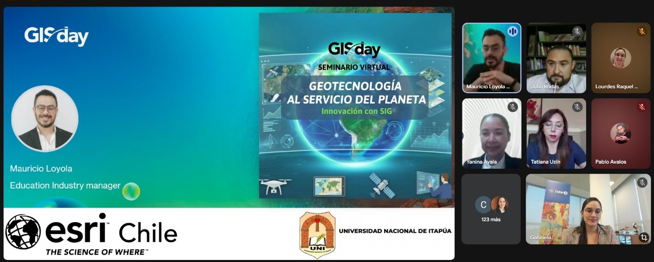 En el marco del GIS Day 2025, se realizó el día 01 de diciembre, el Seminario Virtual “Geotecnología al servicio del planeta: Innovación con SIG”, organizado por la UNI, en conjunto con la Facultad de Ingeniería (FIUNI), Facultad de Ciencias y Tecnología (FaCyT), y la Facultad de Ciencias Agropecuarias y Forestales (FaCAF), con la colaboración de Esri Paraguay–Chile.