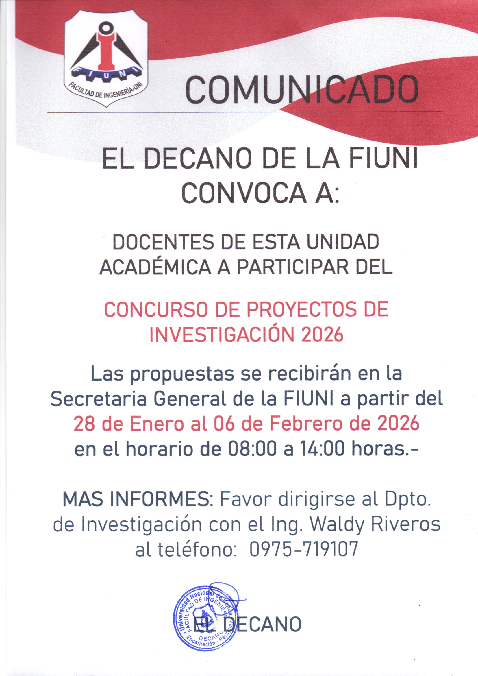 El Decano de la FIUNI llama a concurso de Proyectos de Investigación, para ocupar cargos de Docente Investigador periodo 2026-2027.